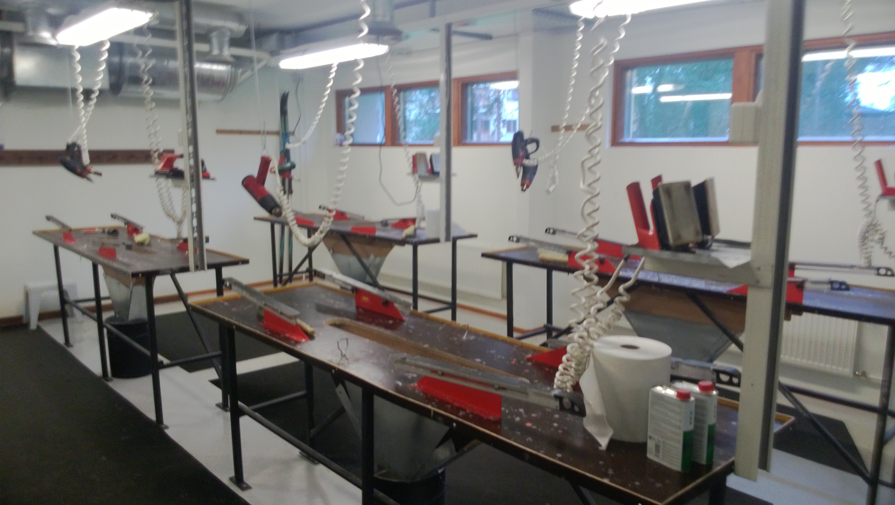 Suksihuoltohuone jatkui vielä muutaman pöydän verran taakseni.