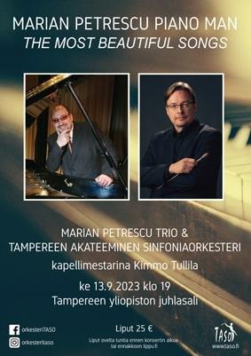 Tampereen akateeminen sinfoniaorkesteri avaa syyskautensa 2023 konsertoimalla maailmankuulun jazzpianon virtuoosi Marian Petrescun kanssa. The Most Beautiful Songs -konsertissa kuullaan kotimaisia ja kansainvälisiä ikivihreitä sovitettuna jazz-triolle ja jousiorkesterille. Jazz-trion muodostavat pianisti Marian Petrescu, basisti Anu Ahjokoski sekä rumpali Sari Kujala. Klassista sekä pop-jazz -musiikkia yhdistelevän ohjelmiston on sovittanut Nellu Petrescu. Konsertin juontaa Casper Petrescu. Marian Petrescun ja Tampereen akateemisen sinfoniaorkesterin jazz-illan johtaa kapellimestari Kimmo Tullila.